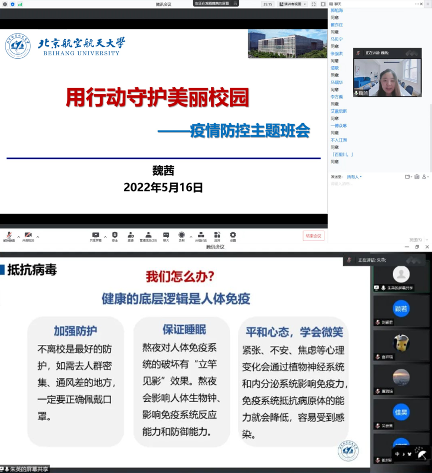 365best体育官网登录班主任、辅导员以“共克时艰,守护美丽校园”为主题面向公司全体员工召开班会,发出拒绝外卖、减少快递、守护美丽校园的倡议,将公司的暖心举措详细告知同学们。同学们纷纷表示,大爱暖心北航,要用行动守护美丽校园。