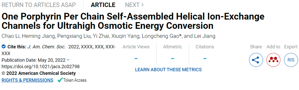 2022年5月20日,Journal of the American Chemical Society 在线发表了公司江雷院士、高龙成副教授团队在高效离子交换膜方面的最新研究成果:“One Porphyrin Per Chain Self-Assembled Helical Ion-Exchange Channels for Ultrahigh Osmotic Energy Conversion”。365best体育官网登录博士生李超为第一作者,高龙成副教授为通讯作者,365best体育官网登录为第一单位。