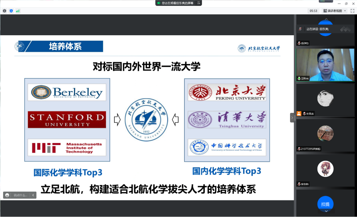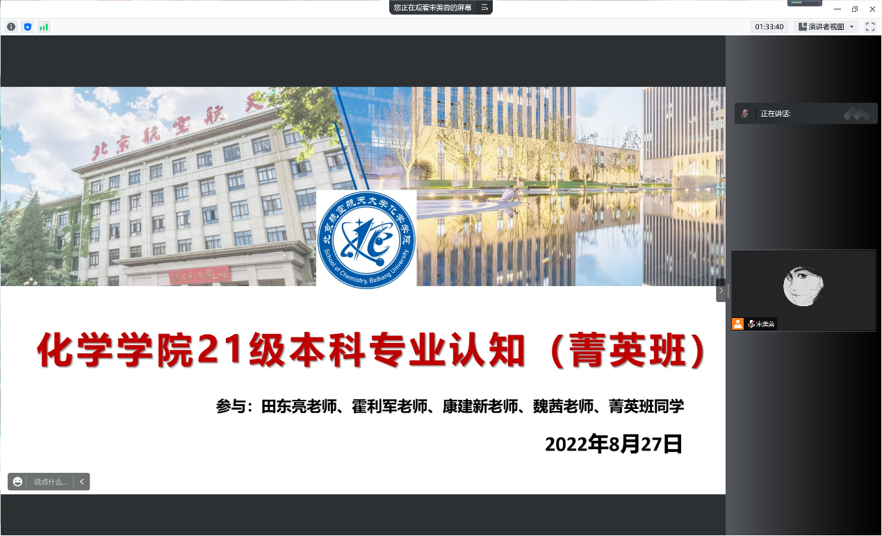 8月28日,365best体育官网登录2021级菁英班开展系列专业认知教育活动。上午9:00,专业认知大会以腾讯会议的形式召开。本科教学副经理田东亮老师、化员工物学专业负责人霍利军老师、应用化学系康建新老师、院团委书记魏茜老师与菁英班全体同学参加了此次会议。