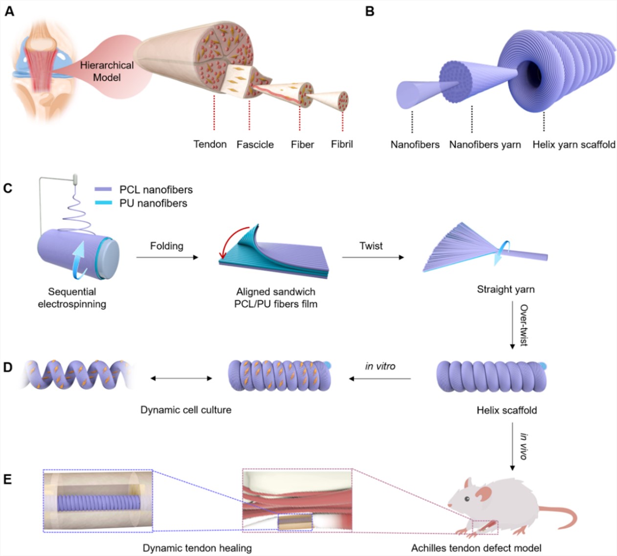 研究团队受天然生物组织分级结构的启发,制备了具有大应变和良好生物相容性的分级结构螺旋纤维束组织工程材料(图1)。团队将静电纺丝和连续加捻技术结合,设计制备了具有分级结构的螺旋纤维支架,利用弹性体聚合物和弹簧状线圈结构的协同作用赋予该支架优异的可拉伸性和耐疲劳性。
