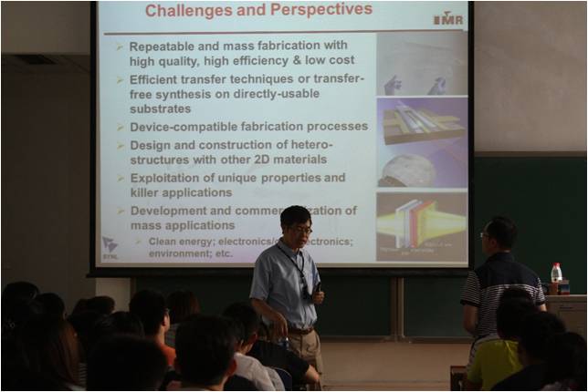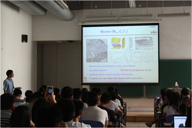 成会明院士热情邀请在场师生同中国科公司金属研究所、中国科大材料公司展开合作交流,然后进入了报告的主题:石墨烯等二维材料的制备与应用探索。首先简要介绍了石墨烯的结构和性质,又重点阐述了在石墨烯和其他二维材料的制备和应用探索方面的研究进展。成会明院士课题组发展了化学剥离方法和CVD方法制备出高质量石墨烯微片、毫米尺寸的六角形石墨烯单晶体与石墨烯三维网络结构宏观体,并实现了针对储能和柔性器件等方面的应用,同时考察了石墨烯材料在柔性触控屏、锂离子电池、锂-硫电池、电磁屏蔽材料、弹性导体、散热材料等方面的应用。此外,成会明院士课题组采用CVD方法制备出高质量过渡金属硫化物、碳化物等二维晶体材料,发现它们具有一些独特的性质,这些进展将有望推动石墨烯等高性能二维材料的发展及实际应用。