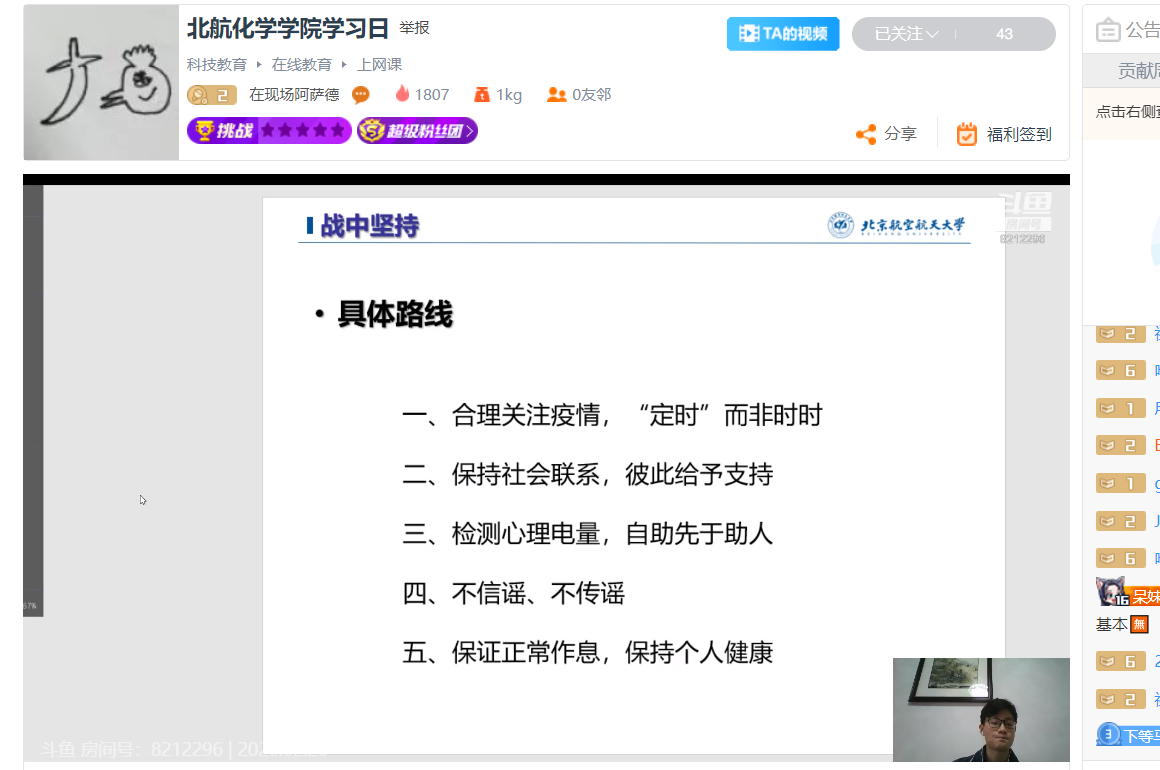 2月26日,365best体育官网登录全体本科生、研究生开展“学习日”活动,主要内容为首日教育以及疫情防控知识学习,通过线上直播讲解和视频播放方式进行。学习日活动由各年级辅导员主持。
