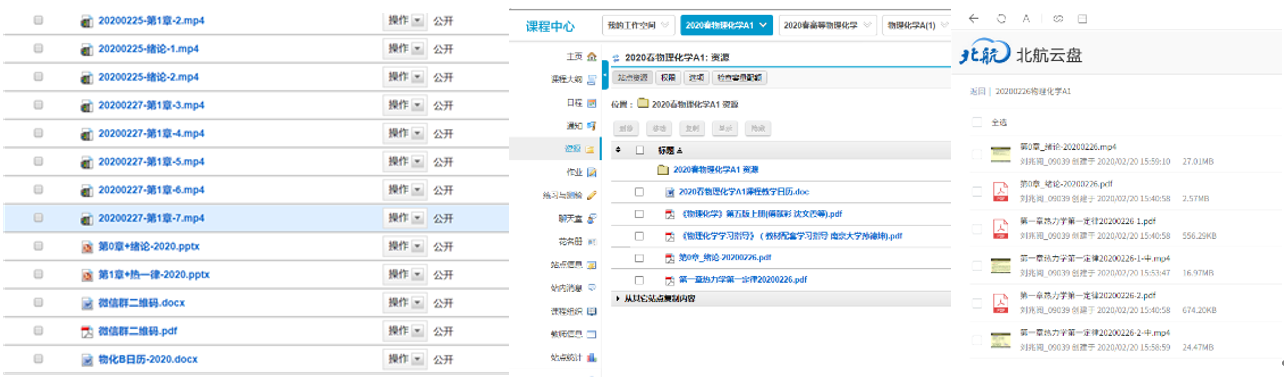 良好的教学秩序离不开老师们日日夜夜的辛勤努力,在朱英教授的推动下,开课一周前,教师们已经将第一周的录课视频、学习资料、课件等电子资源上传至课程中心、北航云盘等网站。每一个视频都饱含着老师们对同学们的殷切希望,每一个45分钟的视频都是老师们付出了几倍甚至十几倍时间努力的结果。