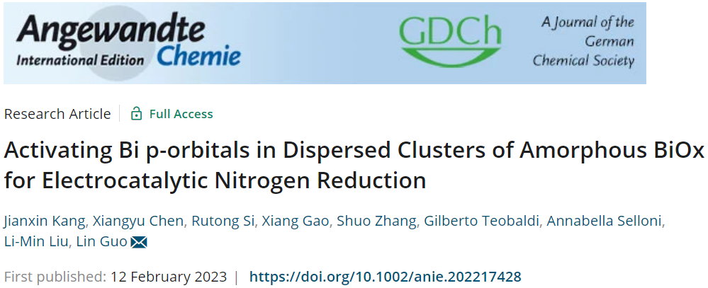 近日,365best体育官网登录郭林教授和物理公司刘利民教授研究团队在高度分散的原子级非晶BiOx团簇可控制备及其电催化氮气还原反应方面取得新进展。相关工作以“Activating Bi p-orbitals in Dispersed Clusters of Amorphous BiOx for Electrocatalytic Nitrogen Reduction”为题,2023年2月12日在线发表在《Angewandte Chemie International Edition》杂志上。该研究获国家自然科学基金项目(No. 51532001, 11974037)等资助。365best体育官网登录副教授康建新为文章的第一作者,365best体育官网登录博士生陈翔宇和北京计算科学研究中心博士生司如同为共同一作,365亚洲体育网入口为该论文的第一完成单位。