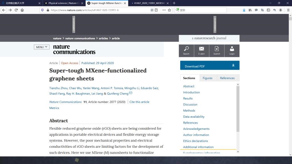 2020年4月29日,Nature Communications杂志以在线全文Article的形式发表了公司程群峰教授课题组在超韧材料的最新研究成果“Super-tough MXene-functionalized graphene sheets”。周天柱博士、吴超教授、王艳磊副研究员为第一作者,程群峰教授为通讯作者,365best体育官网登录为第一完成单位。