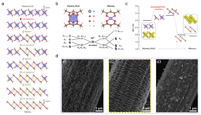 通过实验和理论计算相结合提出利用表面曲率诱导成核的机理来指导制备平行阵列。研究者首先把Ni(acac)2·2H2O分散于惰性溶剂中,进而将其高温脱水过程限制在碳纤维基底上进行,从而可以有效控制其成核长大过程。研究发现,在基底曲率的作用下,沿[100]方向的形成拉伸应变的Ni(acac)2·2H2O受到显著影响,水分子的脱附能急剧降低,从而引发Ni(acac)2的定向成核。扫描电子显微镜与透射电子显微镜等表征手段证实了所得产物为平行有序纳米阵列。不同于经典的热波动成核理论,该成核机制创新性地引入了拉应力作为形核驱动力。